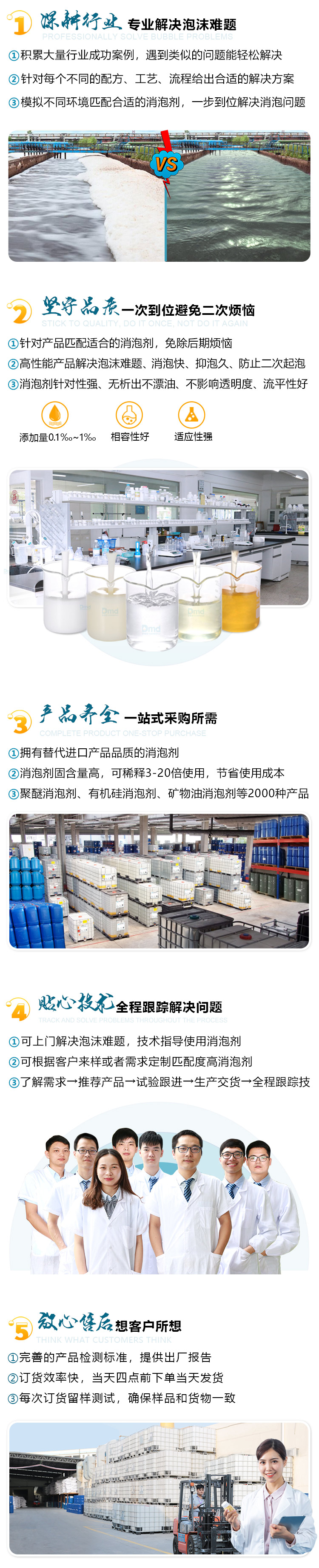 多年來公司面向市場(chǎng),面向真實(shí)各行業(yè)客戶現(xiàn)場(chǎng),對(duì)水處理消泡劑、工業(yè)消泡劑、有機(jī)硅消泡劑、發(fā)酵行業(yè)、清洗劑行業(yè)、金屬加工行業(yè)、造紙行業(yè)、建材行業(yè)、水性粘合劑行業(yè)、紡織印染行業(yè)、油田行業(yè)、水性涂料行業(yè)、印刷材料行業(yè)、電廠脫硫行業(yè)、工業(yè)清洗行業(yè)、家用化學(xué)品行業(yè)、采礦選礦工行業(yè)等32個(gè)行業(yè)工藝、流程及產(chǎn)品配方深入了解,對(duì)各行業(yè)消泡劑應(yīng)用了如指掌,給能客戶提供合適的解決方案,所研發(fā)生產(chǎn)消泡劑適應(yīng)客戶需求和市場(chǎng)需要,能輕松解決客戶遇到的難以解決的消泡難題,減少了客戶使用消泡劑的成本。公司依托完善的售前、售中及售后服務(wù),全程技術(shù)跟進(jìn)消泡劑的試樣到使用過程,節(jié)省了時(shí)間和成本,贏得了業(yè)界各類客戶們的贊譽(yù)!